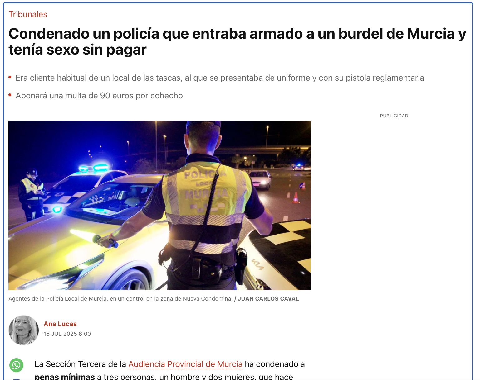 «Condenado un policía que entraba armado a un burdel de Murcia y tenía sexo sin pagar»