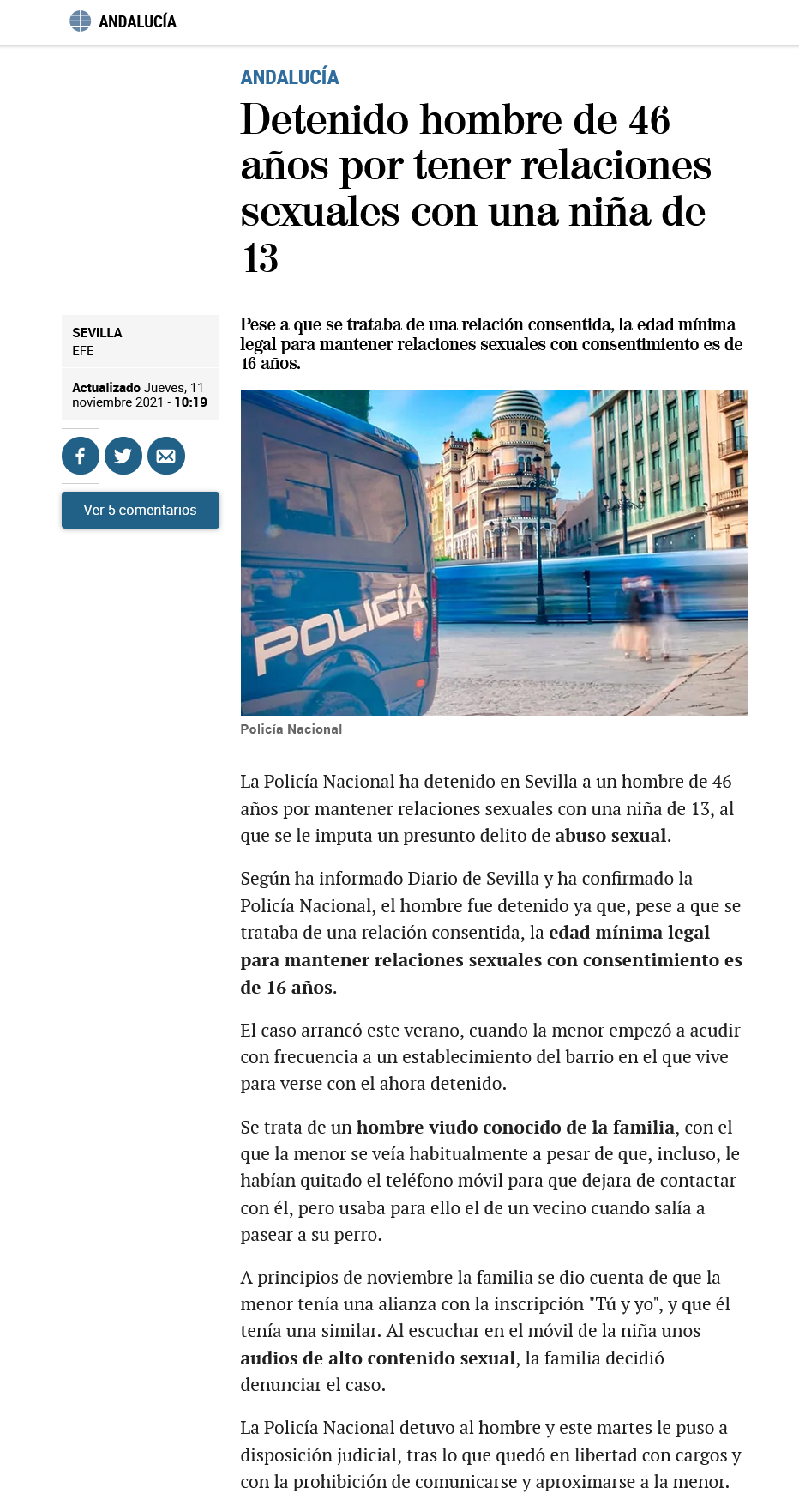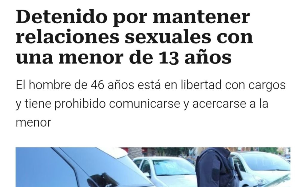 ➟ Titular modificado: «Detenido un hombre de 46 años por tener relaciones sexuales con una niña de 13»
