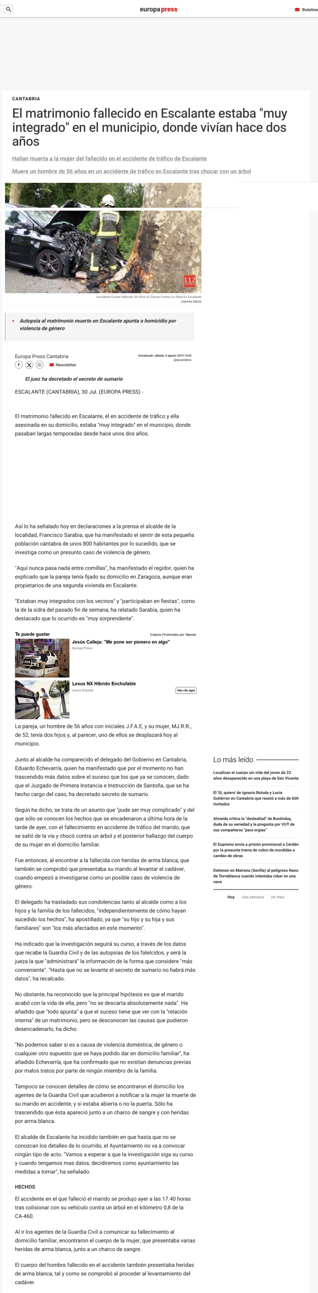 ➟ Por qué es machista: El matrimonio no ha fallecido. El marido es presuntamente el asesino de la mujer, que después murió en un accidente de coche. Además, el uso de ‘muy integrado’ minimiza o elude el caso de violencia machista.