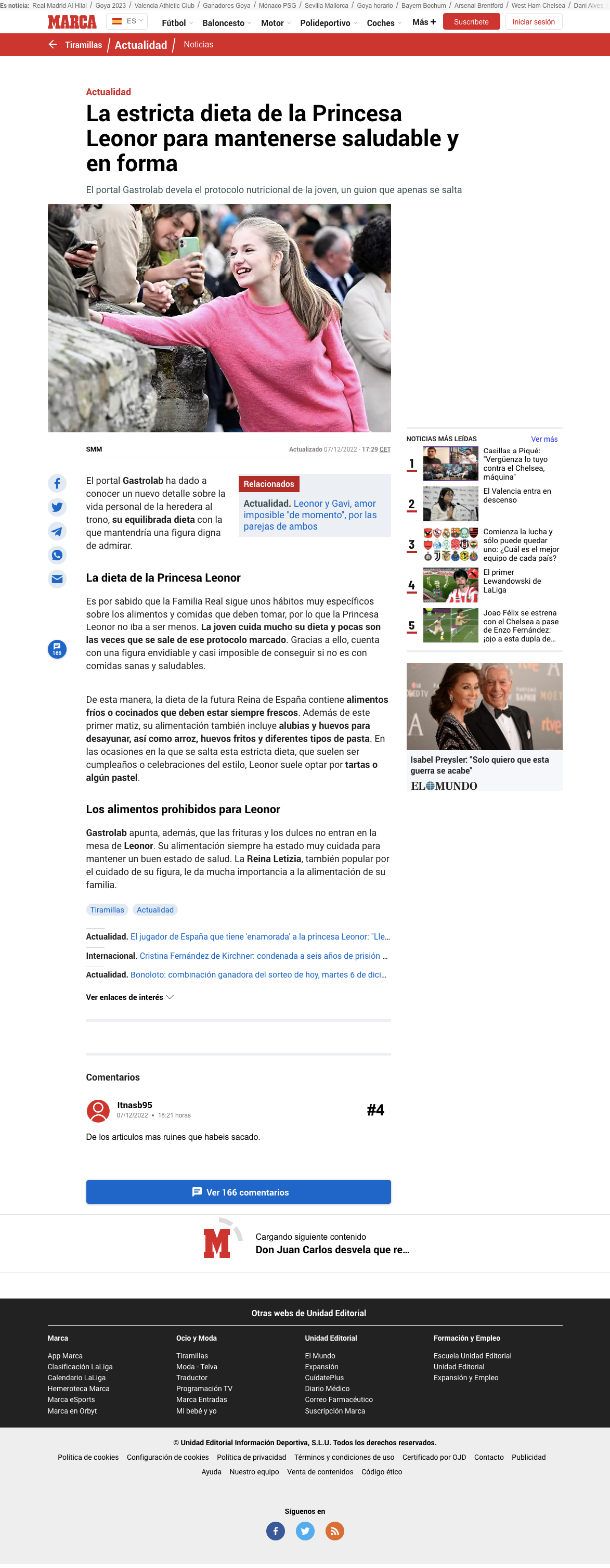 El diario deportivo Marca ha publicado una noticia en la que explica la “estricta dieta” de la princesa Leonor –una adolescente de 17 años– y su supuesta relación con un jugador de la selección española, Gavi, que tiene un año más.