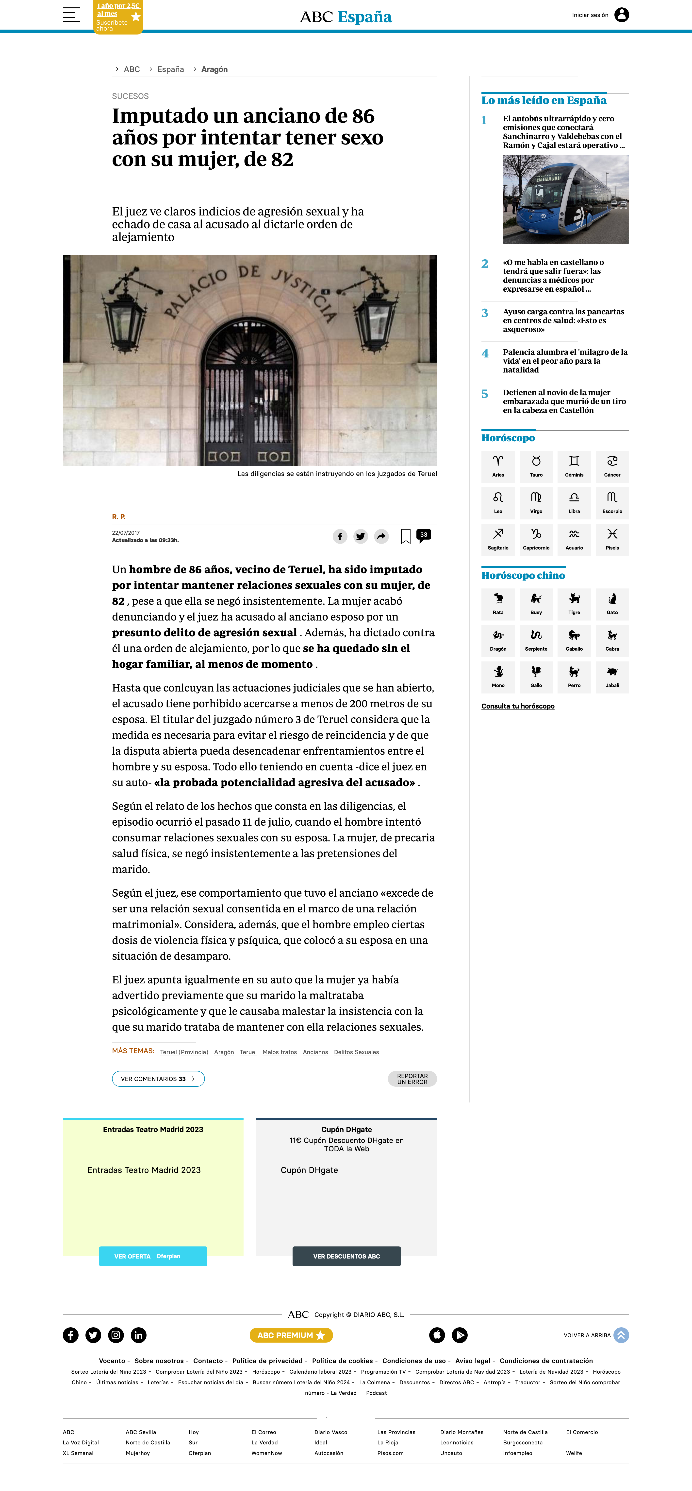 El diario ABC publicó el 22 de julio de 2017 una información en la que informaba sobre la detención de un hombre de 86 años “por intentar tener sexo con su mujer”. Intentar tener sexo no está tipificado en el código penal. Lo que sí es delito es la agresión sexual, que es de lo que se acusa a este anciano.