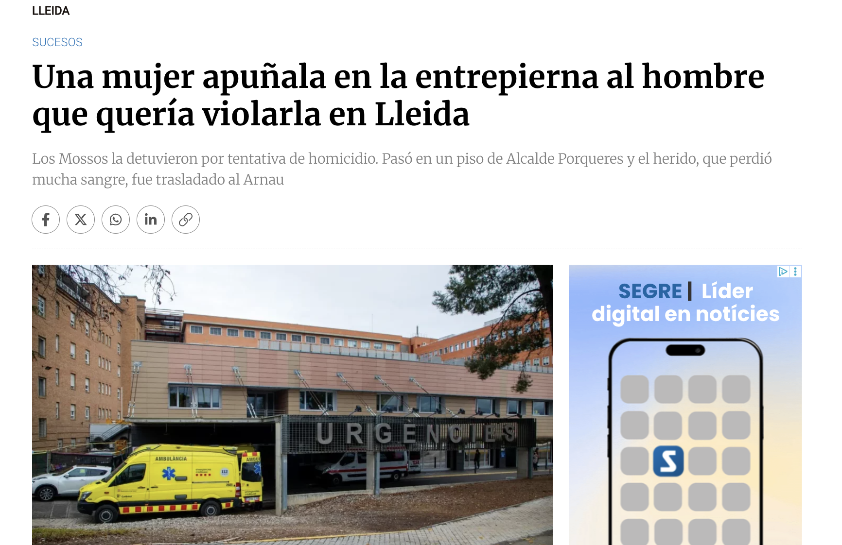 «Una mujer apuñala en la entrepierna al hombre que quería violarla en Lleida»